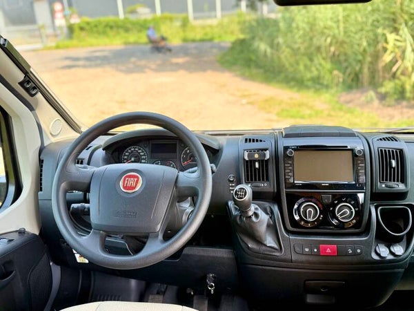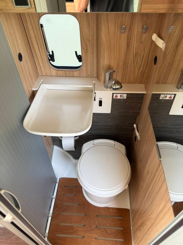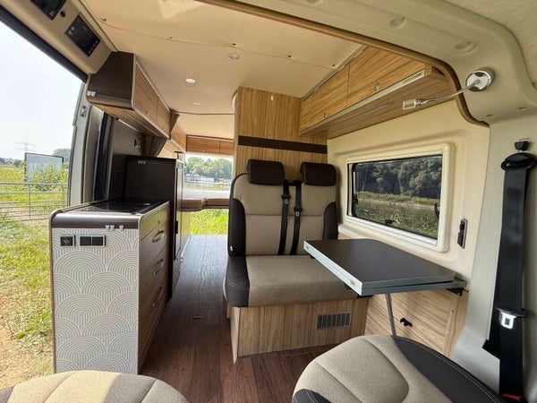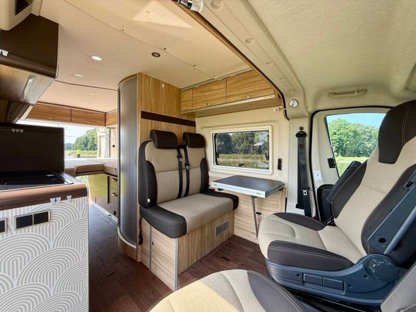 Beide voorstoelen zijn draaibaar, waardoor er een gezellige zitgroep ontstaat (bekleding is in nieuwstaat). De keuken is nauwelijks gebruikt; onder het werkblad bevinden zich drie grote lades voor potjes en pannetjes. De koelkast is een compressormodel dat moeiteloos de temperatuur behoudt. Achterin bevindt zich een ruim, opklapbaar tweepersoons gescheiden bed en op het dak een groot hefdak (slechts enkele keren gebruikt, matras in nieuwstaat). Daarnaast is de camper voorzien van een LED-pakket met extra USB-aansluitingen.