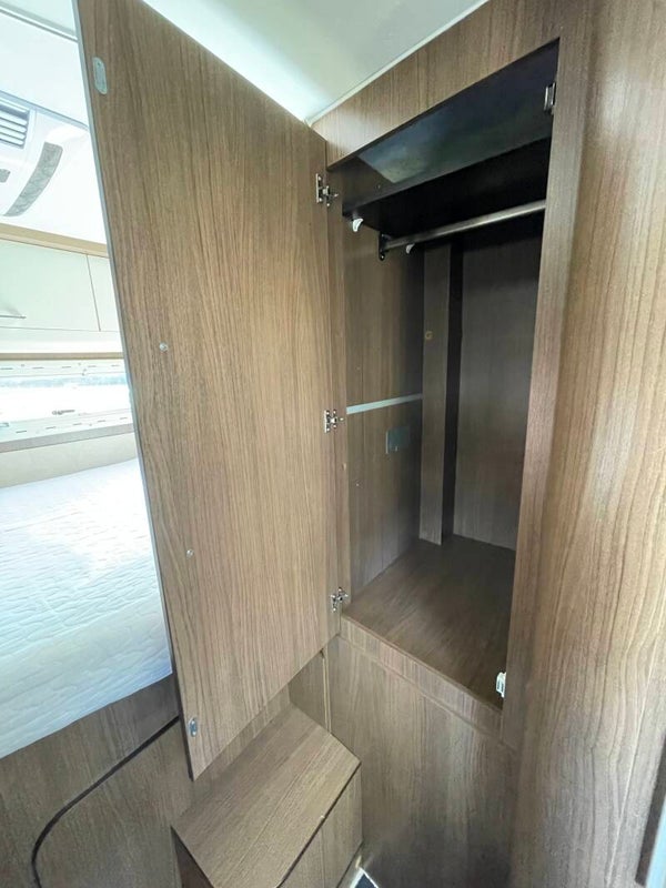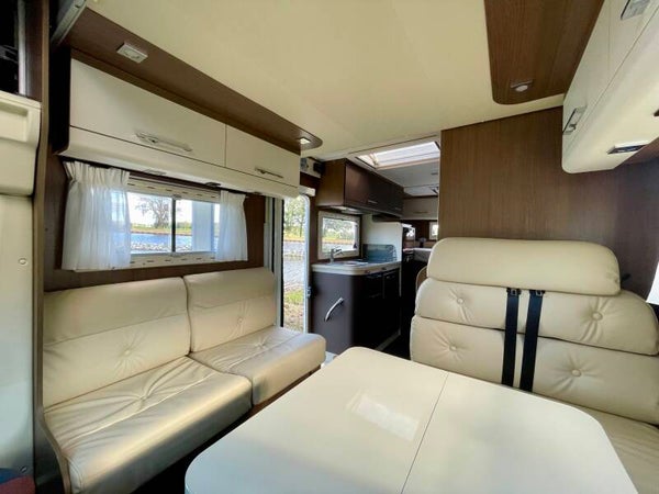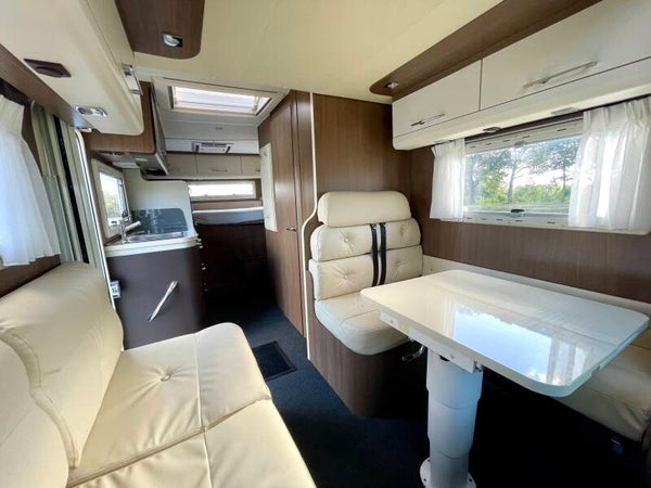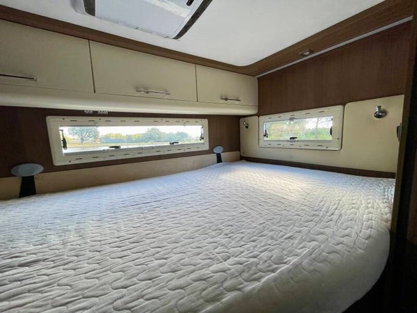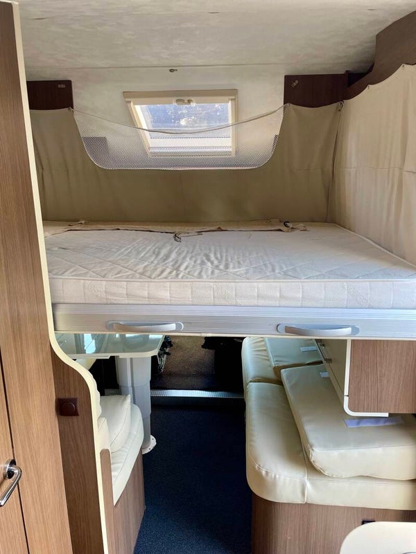 Achterin bevindt zich een ruime garage, ideaal voor fietsen, stoelen en extra bagage. Voor het slapen is er een vast dwarsbed en een centraal hefbed, waardoor de camper ook zeer geschikt is voor een gezin. De grote zitgroep met draaibare voorstoelen zorgt voor een comfortabele leefruimte.
