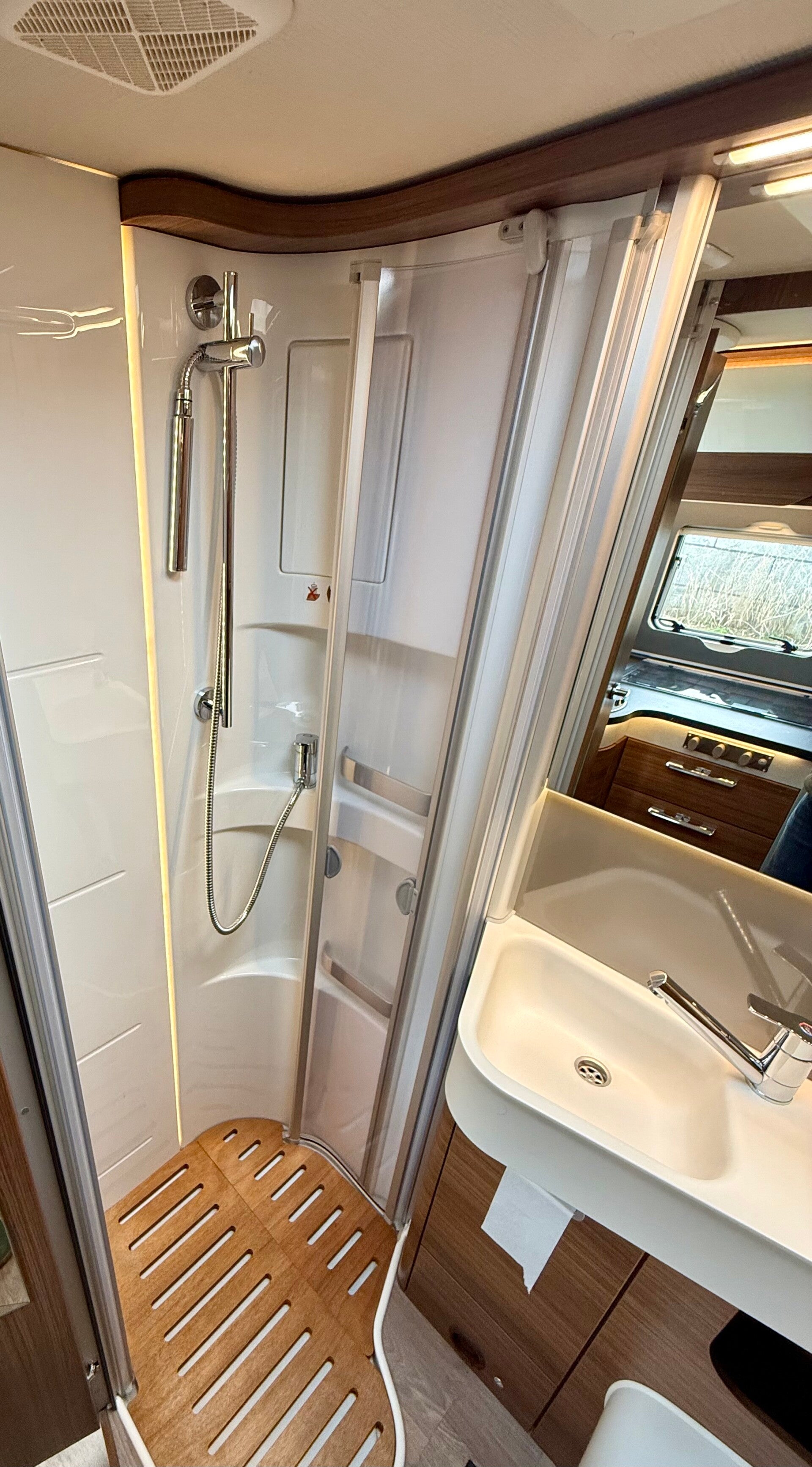 Binnenin valt direct de volledig vlakke vloer op met diepe opbergmogelijkheden die ook van binnenuit toegankelijk zijn. Achterin bevinden zich twee comfortabele enkele bedden die eenvoudig om te bouwen zijn tot één groot bed. Onder de bedden bevindt zich een ruime garage, voorzien van een praktische Veloslide uittrekbare fietsenhouder.