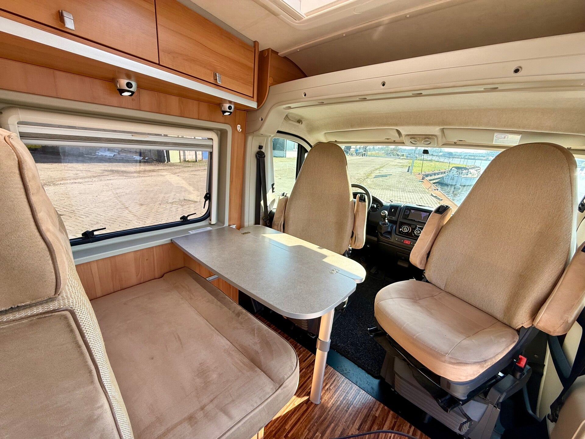 De indeling is doordacht en praktisch. Achterin vind je twee ruime enkele bedden waar je eenvoudig in stapt – comfortabel slapen zonder gedoe. In het midden bevindt zich een nette en ruime badkamer met toilet. De keuken is slim ingedeeld en voorzien van een koelkast op ooghoogte – dus geen gebuk meer, gewoon praktisch gemak.