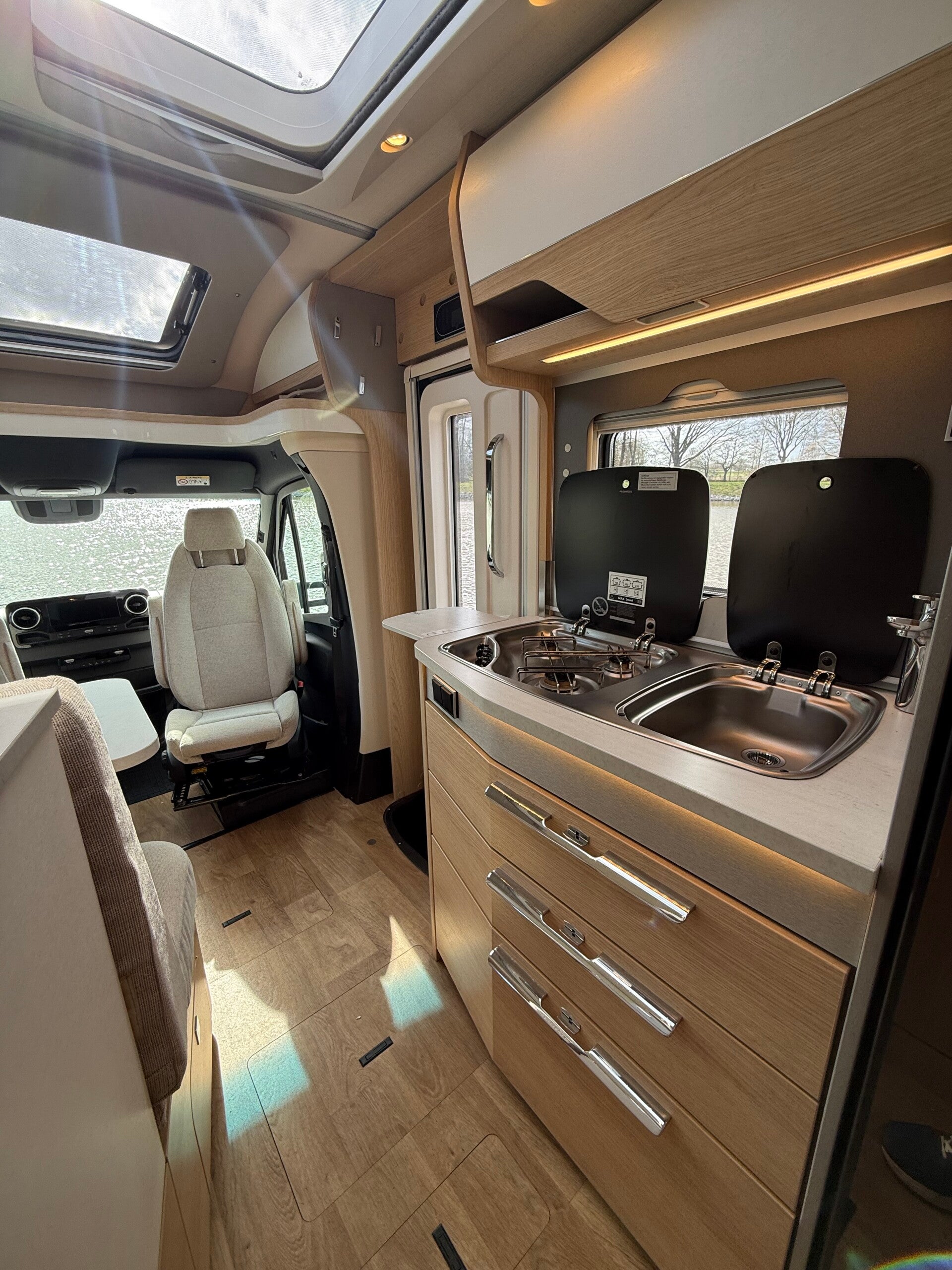 Ook tijdens het rijden is het genieten. De 9-traps automaat schakelt soepel en comfortabel en in combinatie met MBUX en de camera rijdt en manoeuvreert deze camper bijzonder prettig. Met Distronic wordt lange afstand rijden extra ontspannen en veilig. Daarnaast is de camper voorzien van een elektronische handrem, LED High Performance koplampen en grootlicht assistent.