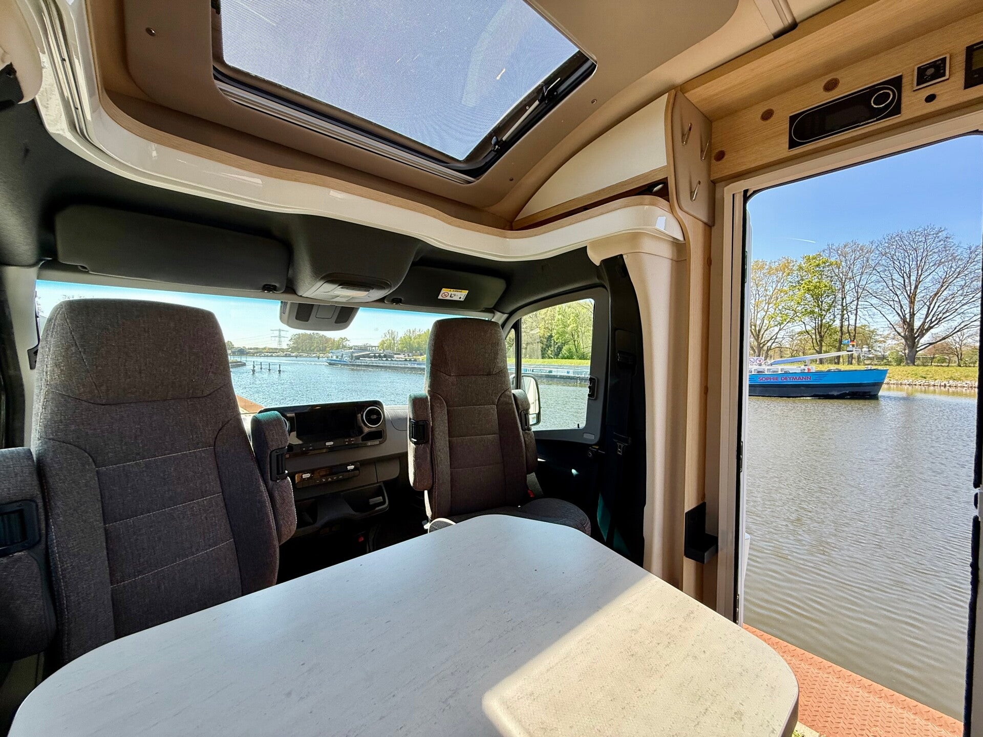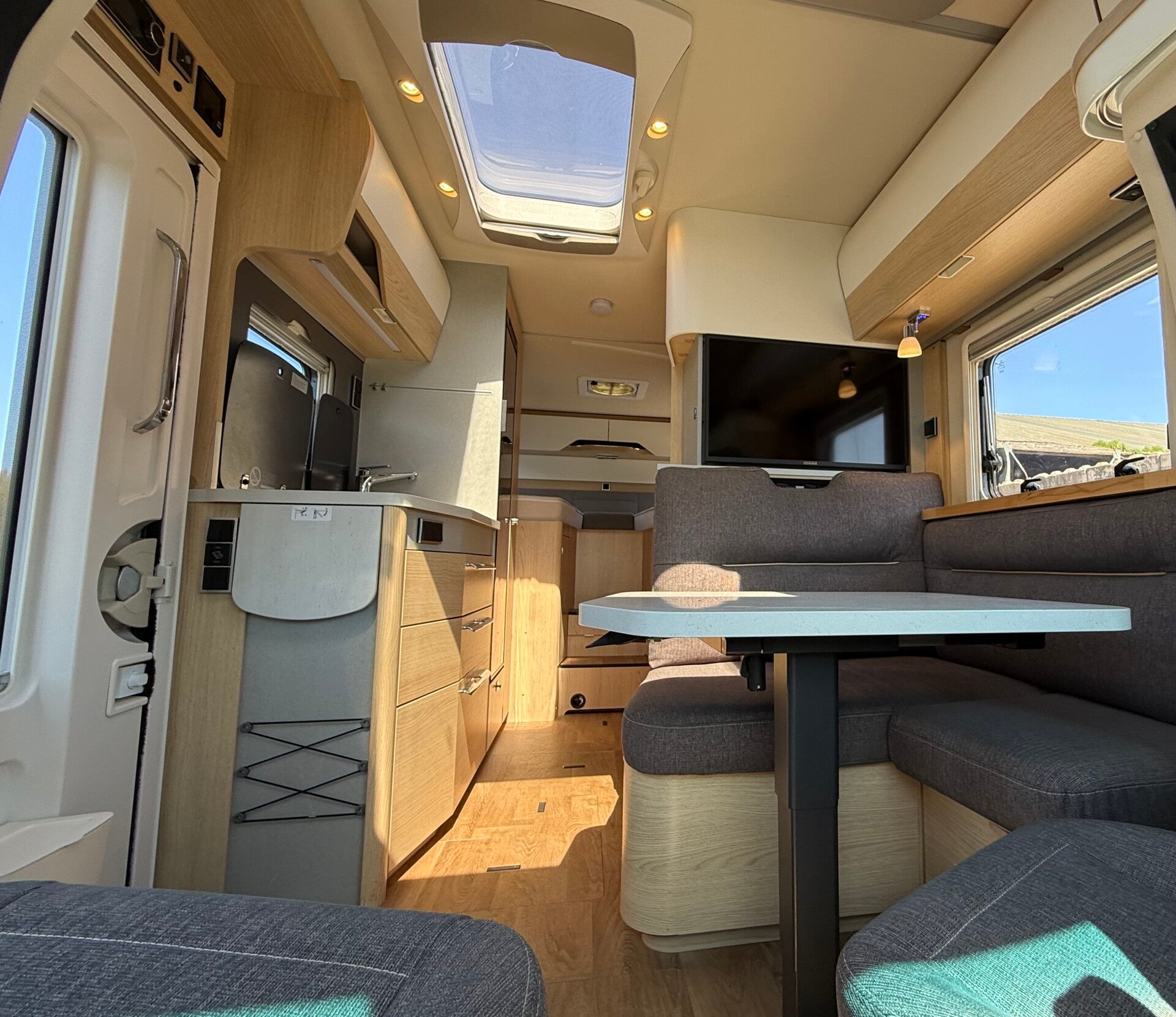 Een stijlvol uitgevoerde camper met een fris en modern interieur. Het lichte hout in combinatie met de grijze bekleding zorgt voor een rustige, luxe uitstraling — warm en tijdloos.
